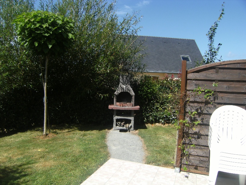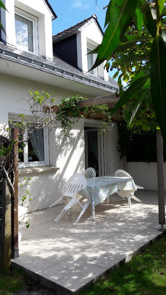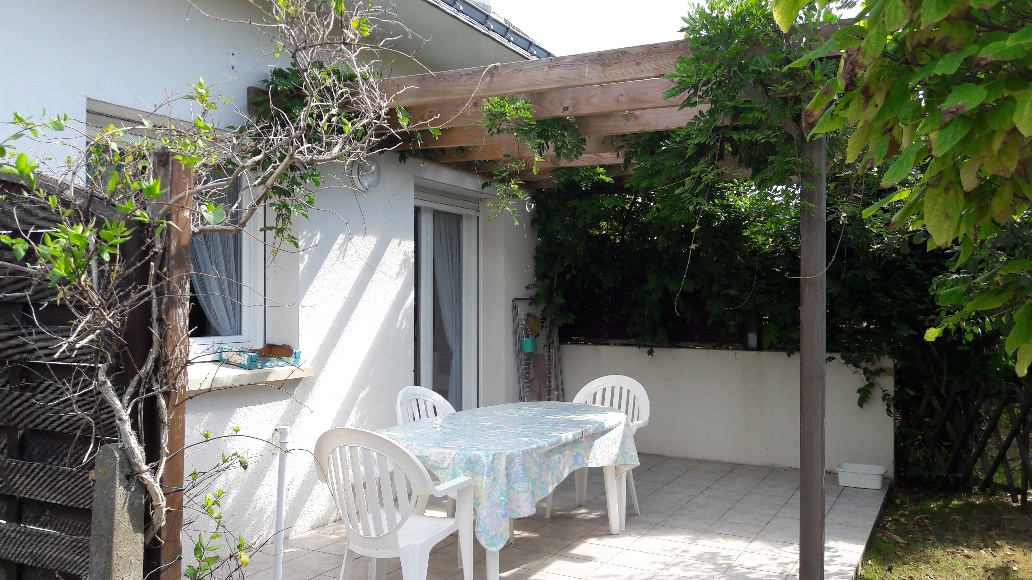 Une terrasse : 30 m2 sous pergola, parasol, salon de jardin, 4 chaises de jardin et 4 transats